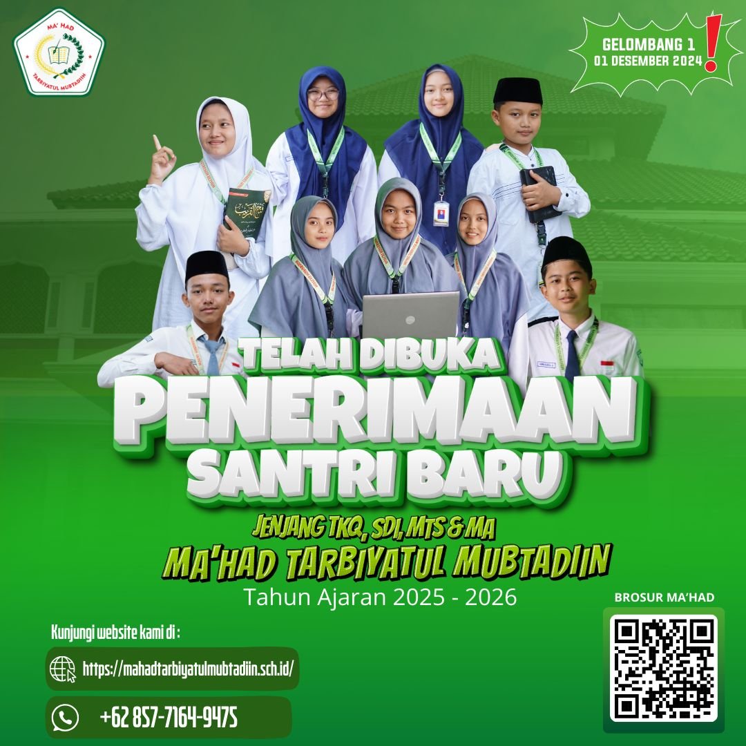 TELAH DIBUKA!Penerimaan Santri Baru Gelombang IIPondok Pesantren Tarbiyatul Mubtadiin membuka pendaftaran santri baru untuk Tahun Ajaran 2025–2026!Periode: Februari – JuniDa