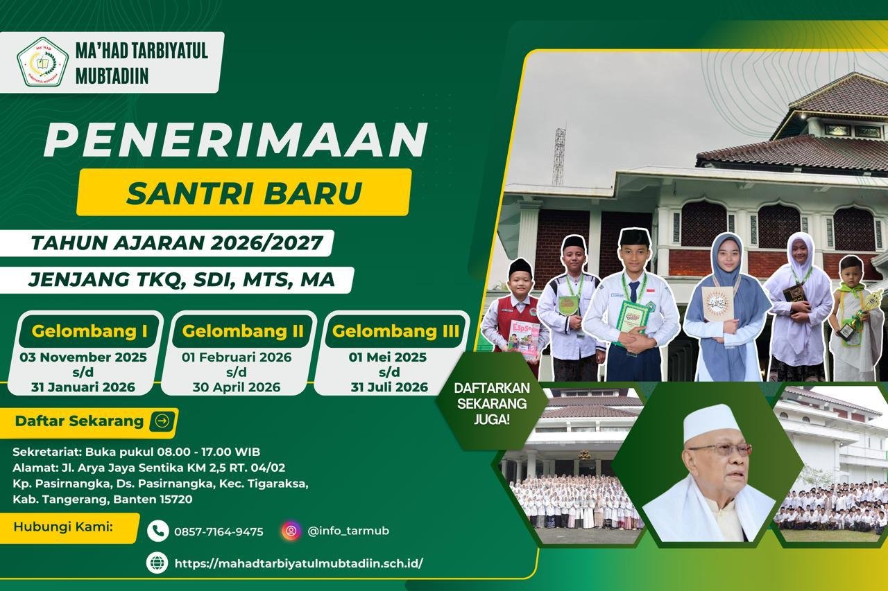 TELAH DIBUKA!Penerimaan Santri Baru Gelombang IIPondok Pesantren Tarbiyatul Mubtadiin membuka pendaftaran santri baru untuk Tahun Ajaran 2025–2026!Periode: Februari – JuniDa